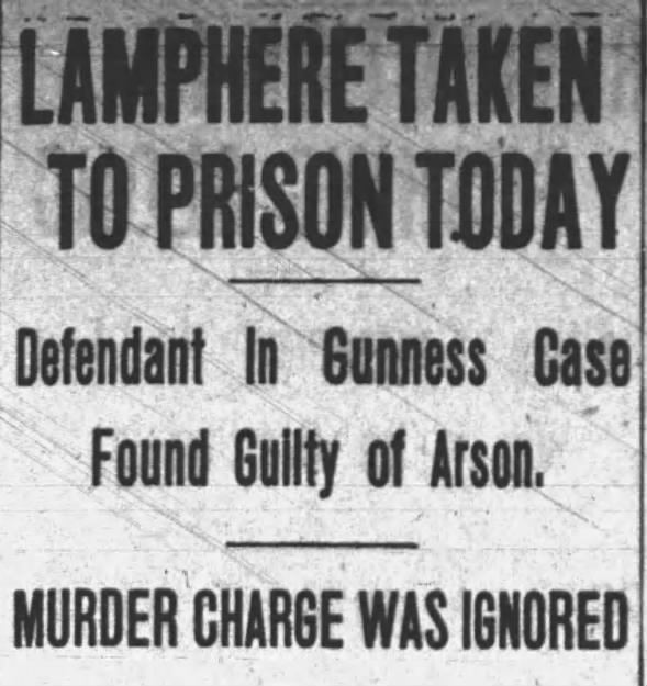 Throughout his trial, and through the rest of his life, Ray Lamphere would continue to plead that he was not guilty of arson or murder. Before he died in prison, Lamphere revealed that Gunness had planned the entire event and skipped town after she withdrew most of the money from her bank accounts.