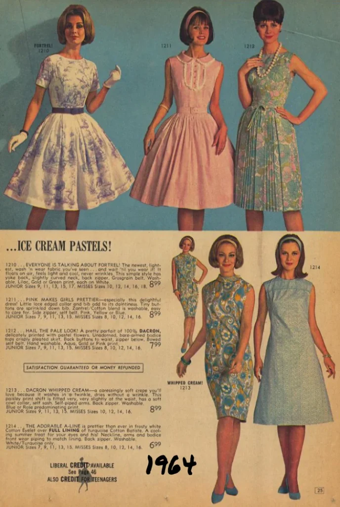 Women wearing bold patterns. Statement earrings and bright colors on model, Twiggy. A catalog from 1965 showing the dress and skirt styles. A couple walks through the city with big sunglasses and hip styles. A young girl in a gingham patterned dress. Boys meet at the corner store. The early punk styles of the 1960s. Fringe and go-go boots. The plaid skirt with high socks became a classic combo.Statement earrings and fun patterns. Polka dots were also in. Men’s swimsuit fashionLeopard print became a very popular print to wear. Another ad in a catalog from 1964. The tie-dye patterns of the early hippie fashion. Casual men’s stylesCher with the striped trousers and 60s makeup lookAnother woman sporting trousers while out and about in the city.A woman working in a fashionable retail store.An example of the beatnik style.Go-go boots and bright patterns. Iconic matching and sparkly outfits. Bright color-blocked styles. An early ad for 60s styles for the youth. A catalog from 1967 demonstrating the mod styleThe high boots and plaid dress were a common and fashionable duo. The bright statement coatsThe ever-iconic mini skirtAudrey Hepburn in a pants suit. A fashion catalog ad from 1964. Models showing the dress styles and popular bob hairstyles. Jackie Kennedy in an infamous pillbox hatSome late-60s hippie fashion starts to appear on the scene. A dress with a collar and the short hairstyle were in fashion. The mini-skirt and go-go boots combo.The beautiful and bright colors on all of the dresses of the era were a 60s staple.An example of the alternative styles of the 1960s. Some laid-back 1960s camping styles.