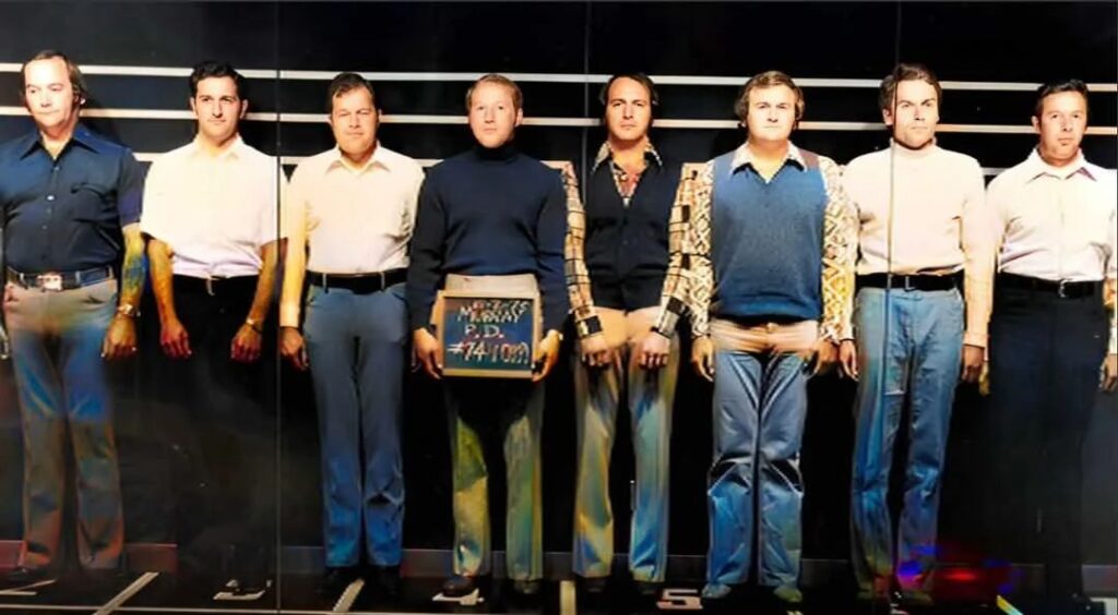 This is a 1970s lineup photo of Ted Bundy. Bundy is second from the right.