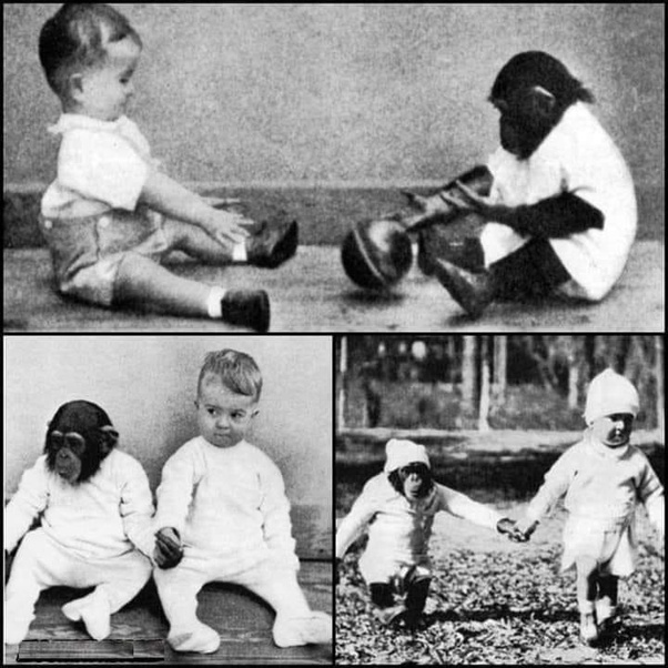 In 1931, two psychologists, Winthrop and Luella Kellogg, began an experiment to see if a chimpanzee could learn human behavior by raising it with their own baby. The idea was to see if the chimp, named Gua, would learn to walk upright, speak, and engage in other human-like activities.