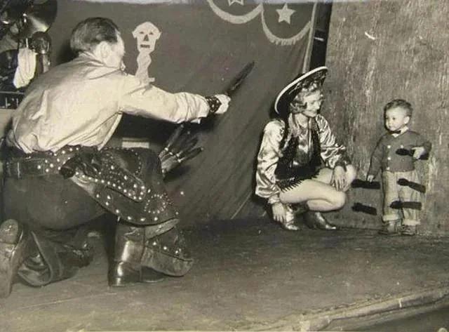 Knife thrower and child in 1940s