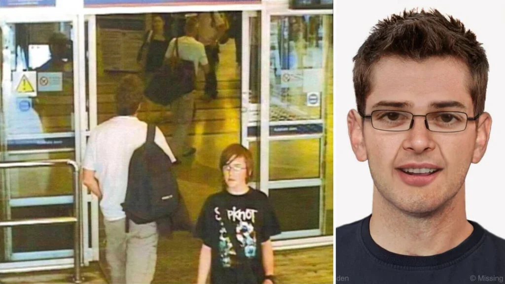 This composite shows Andrew Gosden’s last CCTV frame alongside an age-progressed image. The 14-year-old, known for his quiet intelligence, bought a one-way ticket to London in 2007, stepped into King’s Cross Station, and disappeared from view.