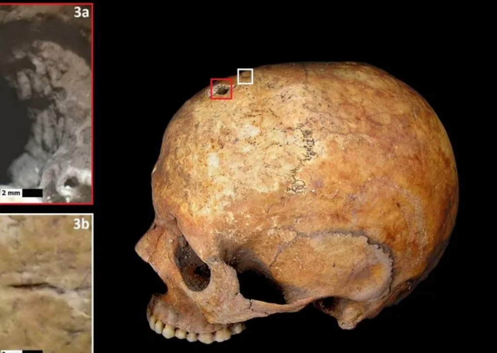 The minuscule bones were that of her unborn child, expelled from her body after her death. This is due to a gruesome phenomenon known as coffin birth. The skull hole is the result of a medieval medical procedure called trepanation.