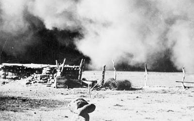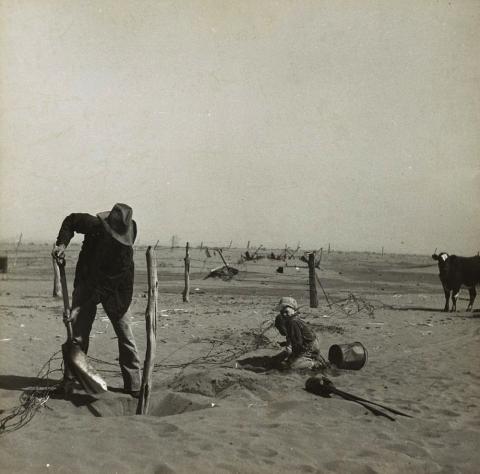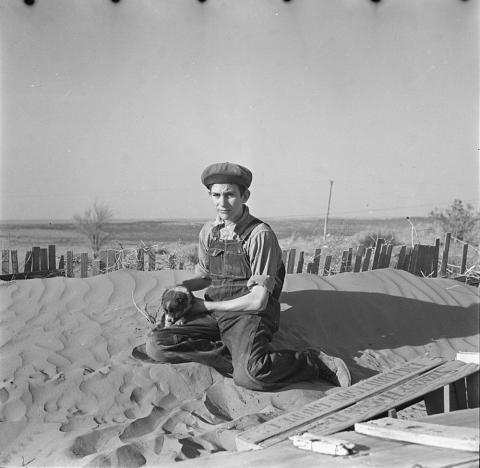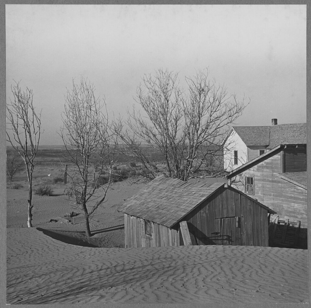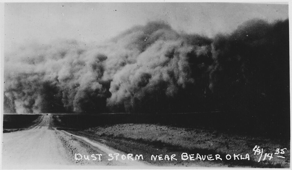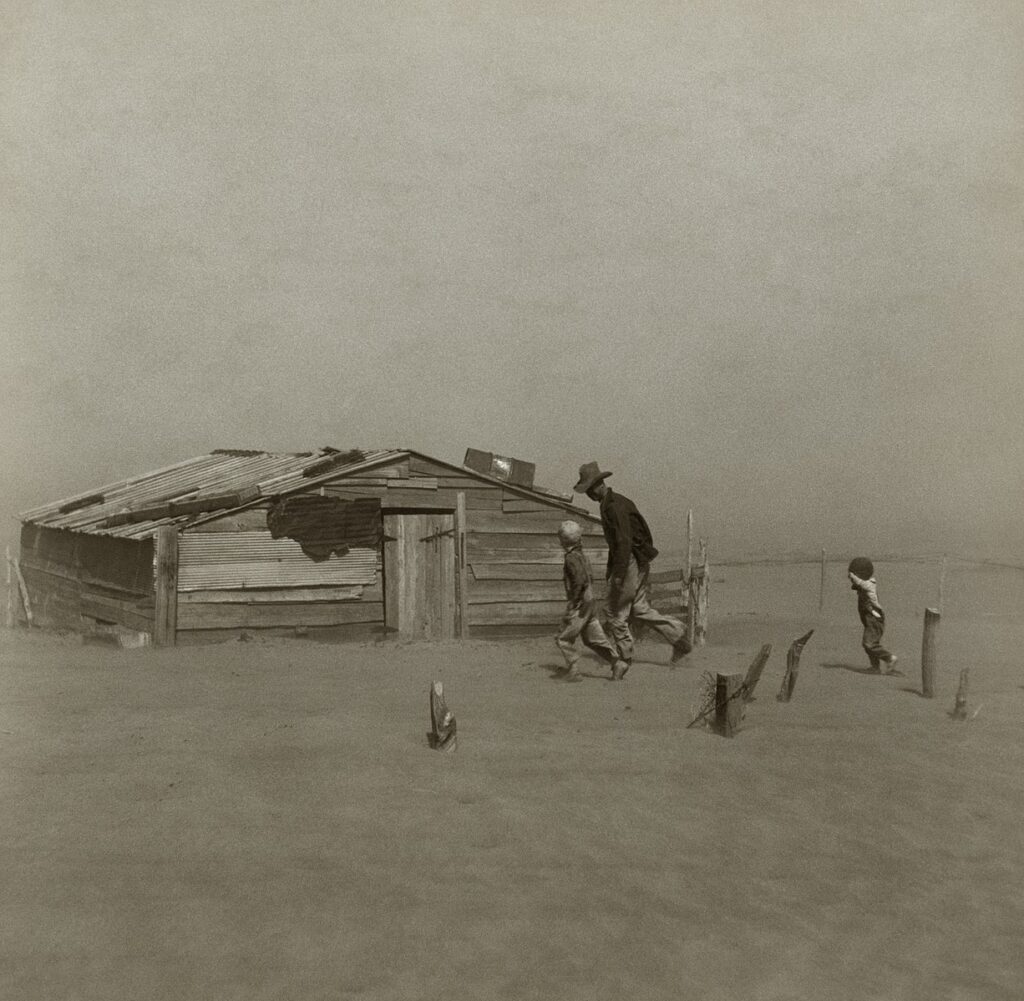 Dust storm approaching Stratford, Texas. 1935Dust storm approaching Spearman, Texas April 14, 1935Dust Storm Near Beaver, Oklahoma. 1935Buried machinery in barn lot in Dallas, South Dakota. 1936Heavy black clouds of dust rising over the Texas Panhandle, Texas. 1936Farmer and sons walking in the face of a dust storm. Cimarron County, Oklahoma, USA. 1936Dust Storm Approaching Spearman, Texas. 1935A farmer’s son in Cimarron County, Oklahoma during the Dust Bowl era. 1936Dust Storm in Liberal, Kansas. 1935Dust Bowl farm. Coldwater District, north of Dalhart, Texas. 1938One of South Dakota’s Black Blizzards, 1934Homestead and farm in Texas County, OklahomaRolla, Kansas. 1935Soil blown by dust bowl winds piled up in large drifts on a farm, Kansas. 1936Dust storm Baca Co., Colorado. 1935Abandoned Dust Bowl Home. 1938Severely eroded farmland during the Dust Bowl, 1930’sA farmer inspects his wind eroded fields and during the Dust Bowl, in 1938 in Colorado.Women using masks to filter out inhaling the dust Dorothea Lange’s famous “Migrant Mother” photographWind erosion carries topsoil from farmland during the Dust Bowl, 1930’sKeota, Colorado abandoned during Dust Bowl. 1939Oklahoma dust bowl refugees, San Fernando, California. 1935Farmers migrating away from the Dust Bowl areaOn the highway heading out of Oklahoma. 1938.A farmer’s son playing with a puppy on one of the large soil drifts which threaten to cover up his home. Liberal, Kansas, March 1936President Roosevelt visiting a farmer who received a drought relief grant, Mandan, North Dakota, 1936Orchard destroyed by drifting sand. Cimarron County, Oklahoma, April 1936Dust storm. Amarillo, Texas, April 1936Dust bowl farmer raising fence to keep it from being buried under drifting sand. Cimarron County, Oklahoma, April 1936Oklahoma farm family on highway between Blythe and Indio, August 1936Dust storm in Colorado. 1936