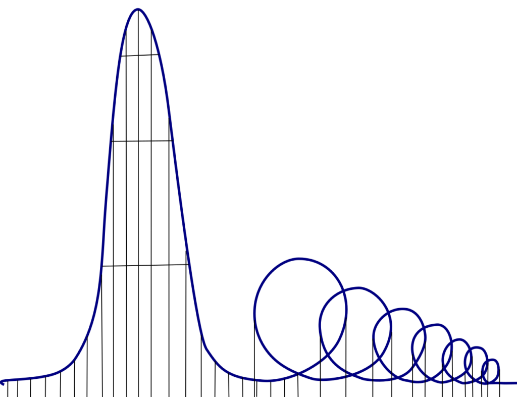 In order for the Euthanasia Coaster to kill its riders in a humane manner, it must maintain a lethal level of 10 g force for 60 seconds. This is accomplished through the series of increasingly smaller loops – each one getting smaller and smaller.