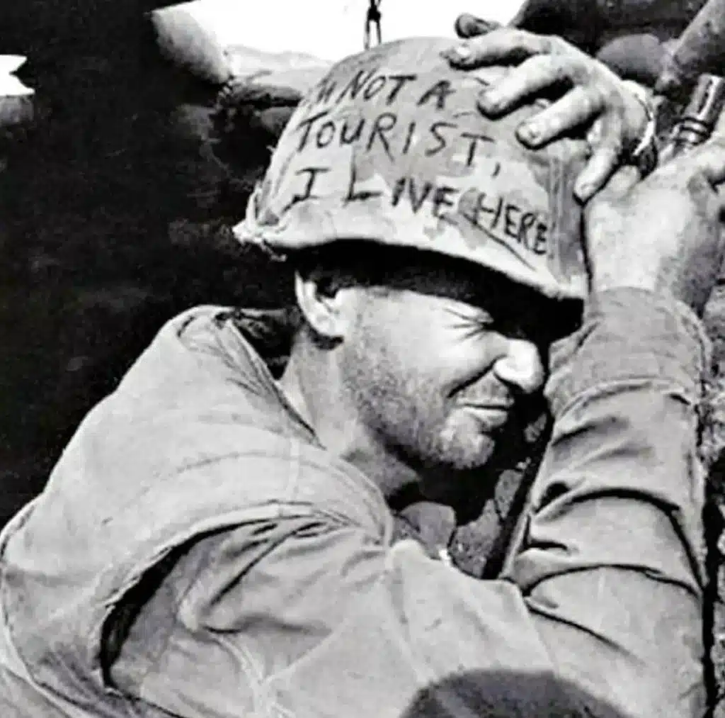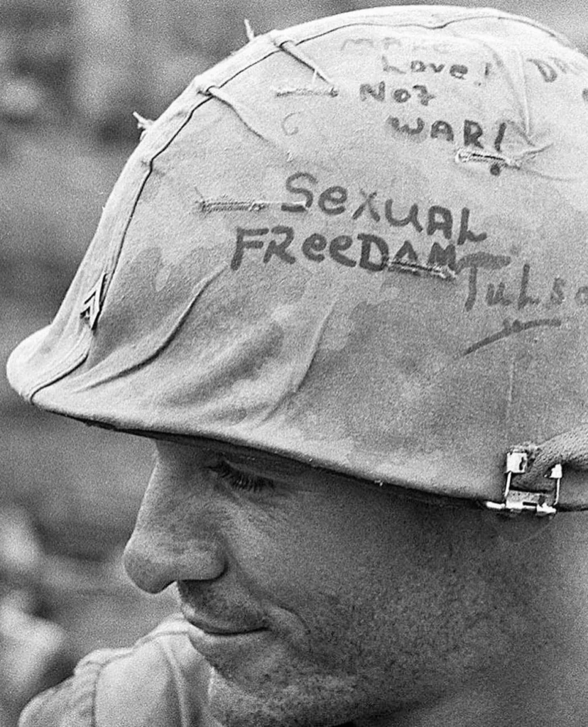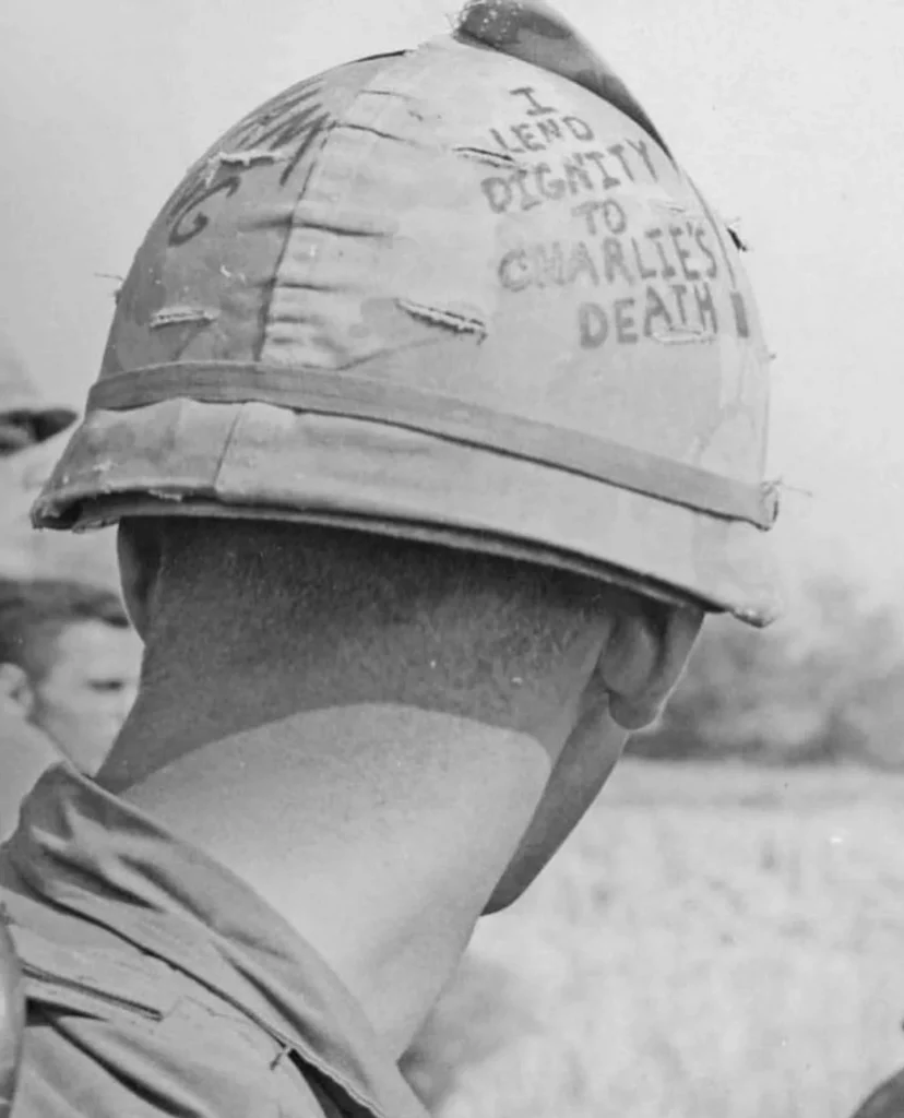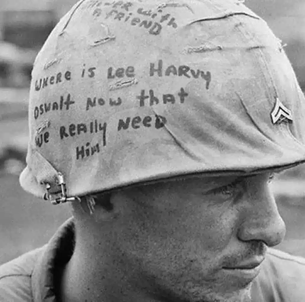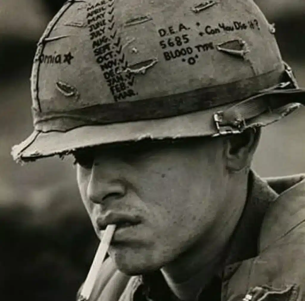 The photograph of this soldier and his helmet graffiti was taken by photojournalist Horst Faas on June 18, 1965, during the Vietnam War with the 173rd Airborne Brigade Battalion. It has become one of the most iconic and unforgettable images to come out of the Vietnam War.