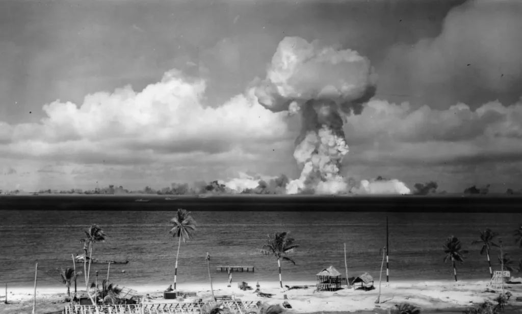 The United States tested the first H-bomb in 1952 at the Eniwetok atoll in the Marshall Islands. The test proved just how devastating the bomb could be as the island was vaporized as a 25-mile fireball blew a hole in the ocean floor.