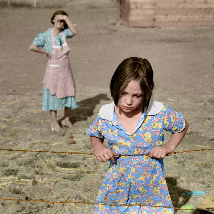 Two young boys sit on their porch, 1935. Hooverville built in Central Park. Civilian Conservation Corps members repair a truck in Yosemite.A bank run, 1933.Kids line up for free soup and breadHomeless man sleeps by the docks, 1935. A soup line ran by Al Capone.The homeless sit outside of their huts in Manhattan, NY.A poor family during The Great DepressionHanding out food packages to the needy in New York CitySalvation Army soup kitchenSharecroppersA family of migrants say grace before lunch.The iconic children for sale photoTwo boys play a game of golf. Waiting in line for assistance.Waiting in line for food at a Franciscan church.A dust storm in Stratford, Texas. April 18, 1935.The iconic photo by Dorthea Lange of a migrant mother. Heading to California in search of work.Waiting for foodA young girl at a migrant camp.A family poses outside of their shack in Klamath Falls.A young boy shows off his bike. Photo by Dorthea LangePublic works project in Washington DCA dugout homeA juke joint in a sharecropper camp.Children eat BBQ