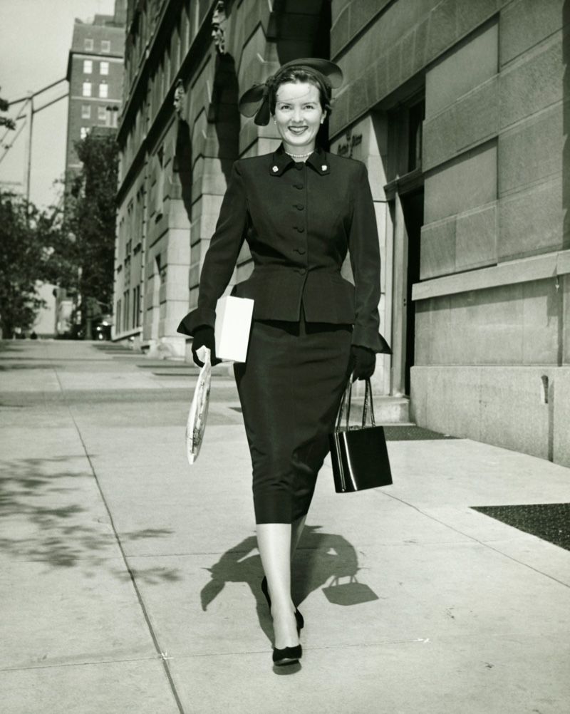 The New Look was famous for it’s hourglass shape. Structure was built into the garments themselves to give the padded shoulder, slim waist, and wide skirt look.