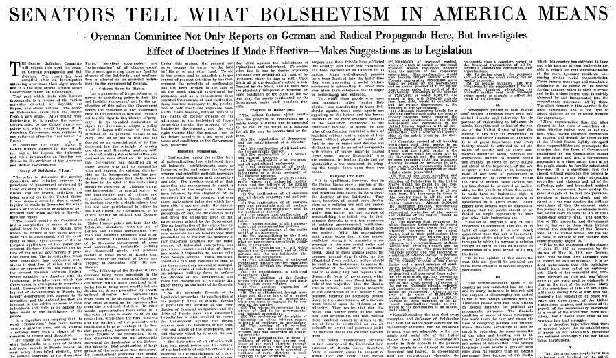 The Overman committee worked from September 1918 to June 1919, when it published its final report. The 35,000-word document proffered a damning look at how far communists had infiltrated American society.