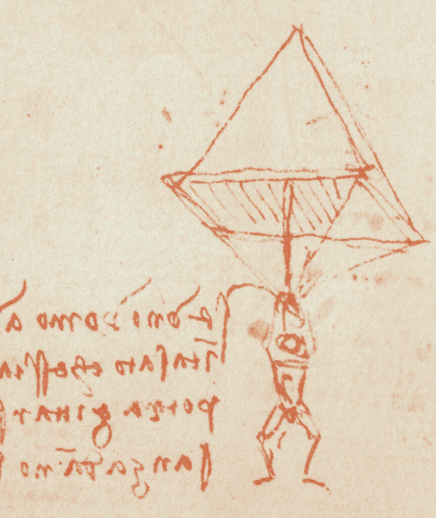 Amongst these designs was something that looks and functions unlike anything that existed during Leonardo’s time, The parachute. The sketch depicted a person descending from the center of a pyramid-shaped canopy-like instrument.