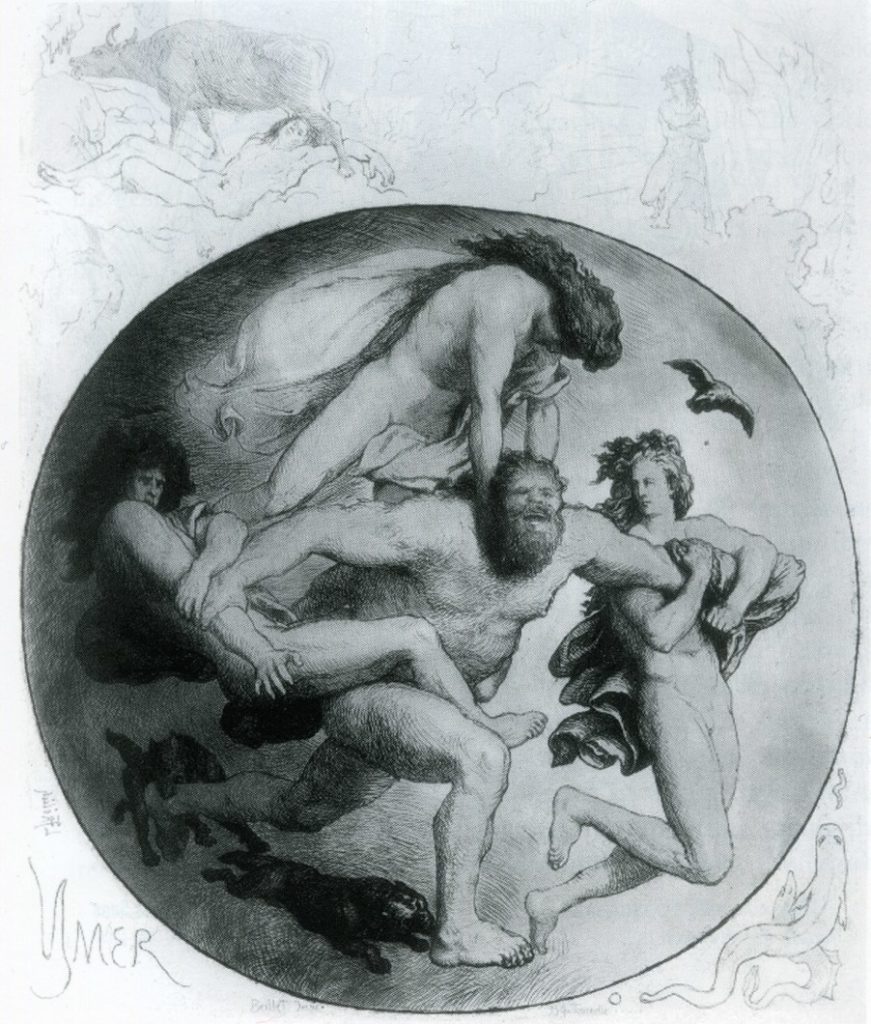 The resulting drops from the melting ice came together to form the being Ymir; Ymir is known as the ancestor of the giants. Then Ymir’s sweat gave birth to a male and female, and his legs also conceived a child.